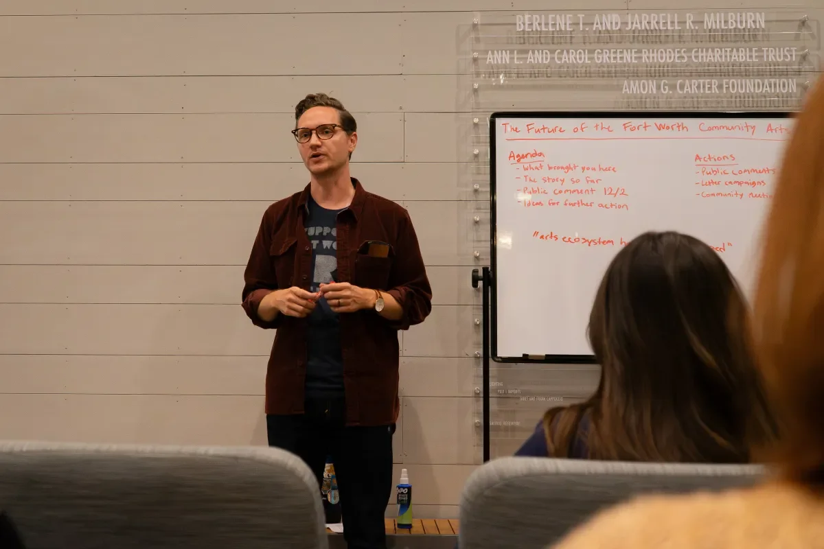 Wesley Kirk talks with art leaders and artists about ways to advocate for the redevelopment of the Fort Worth Community Arts Center. (David Moreno | Fort Worth Report)